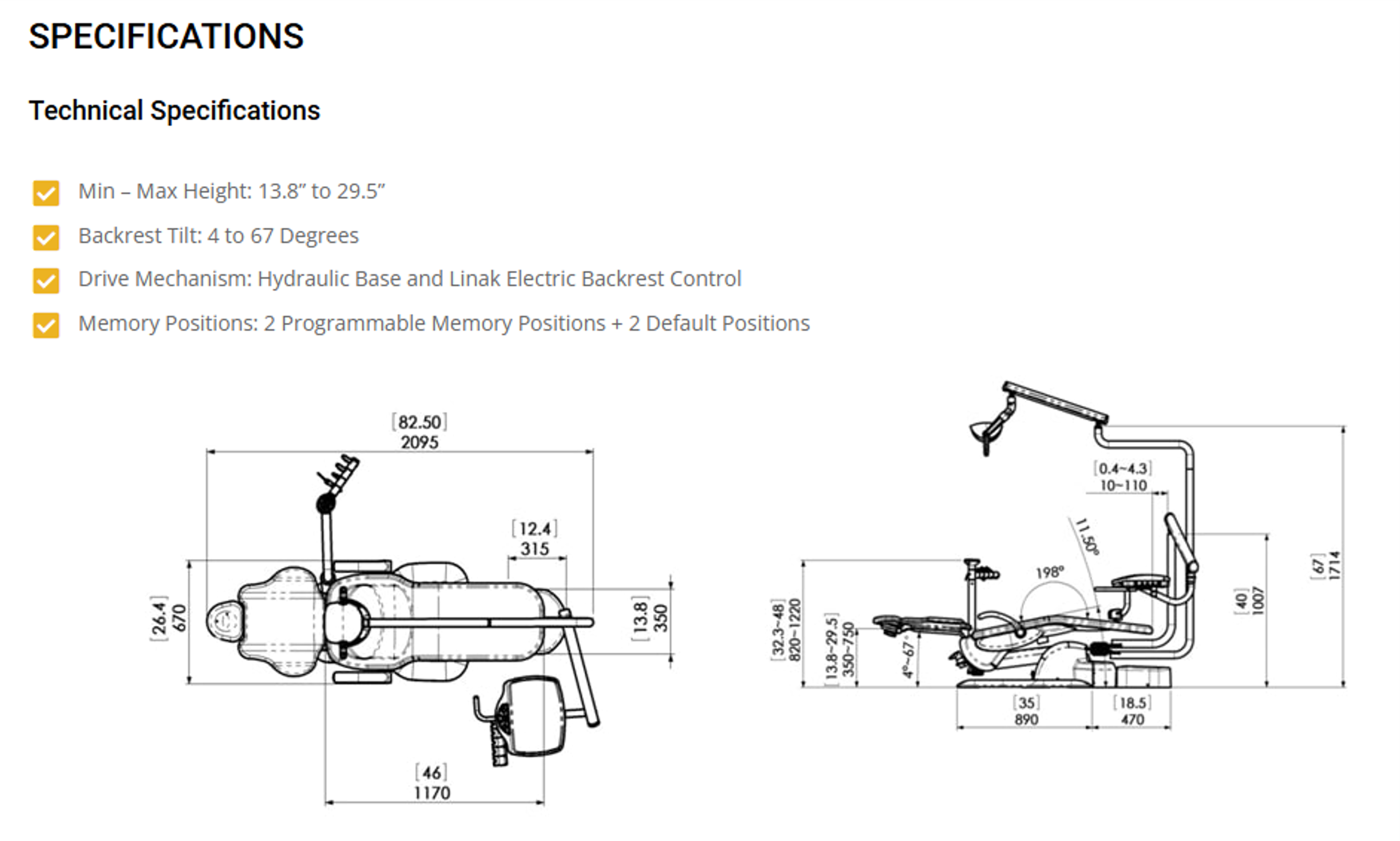 The Flight A6 Radius offers a hybrid model patient chair using both electric motors and hydraulic motors to drive the chairs movement. The Backrest is controlled with a reliable and robust Linak Actuated motor and the base up/down movement is controlled by a strong Fine Sinter Hydraulic Motor made in Japan.