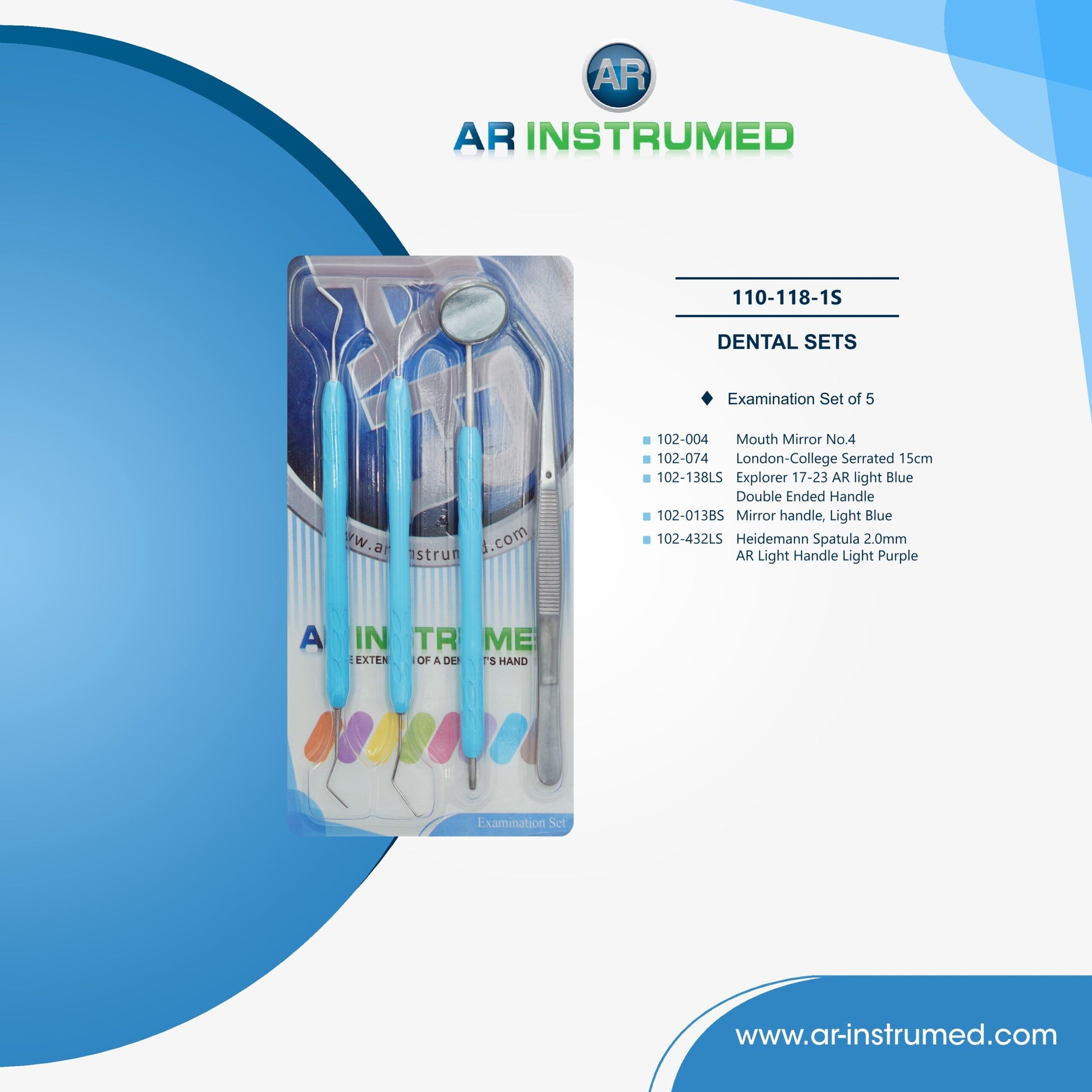 The AR Instrumed Examination Set of 5 is tailored to meet the demands of modern dental and medical practices. Ideal for routine check-ups and detailed diagnostic procedures, this set ensures that practitioners have the right tools to perform thorough examinations. By providing enhanced visibility, precise control, and ergonomic comfort, the set supports accurate diagnosis and effective patient care, ultimately contributing to improved treatment outcomes.