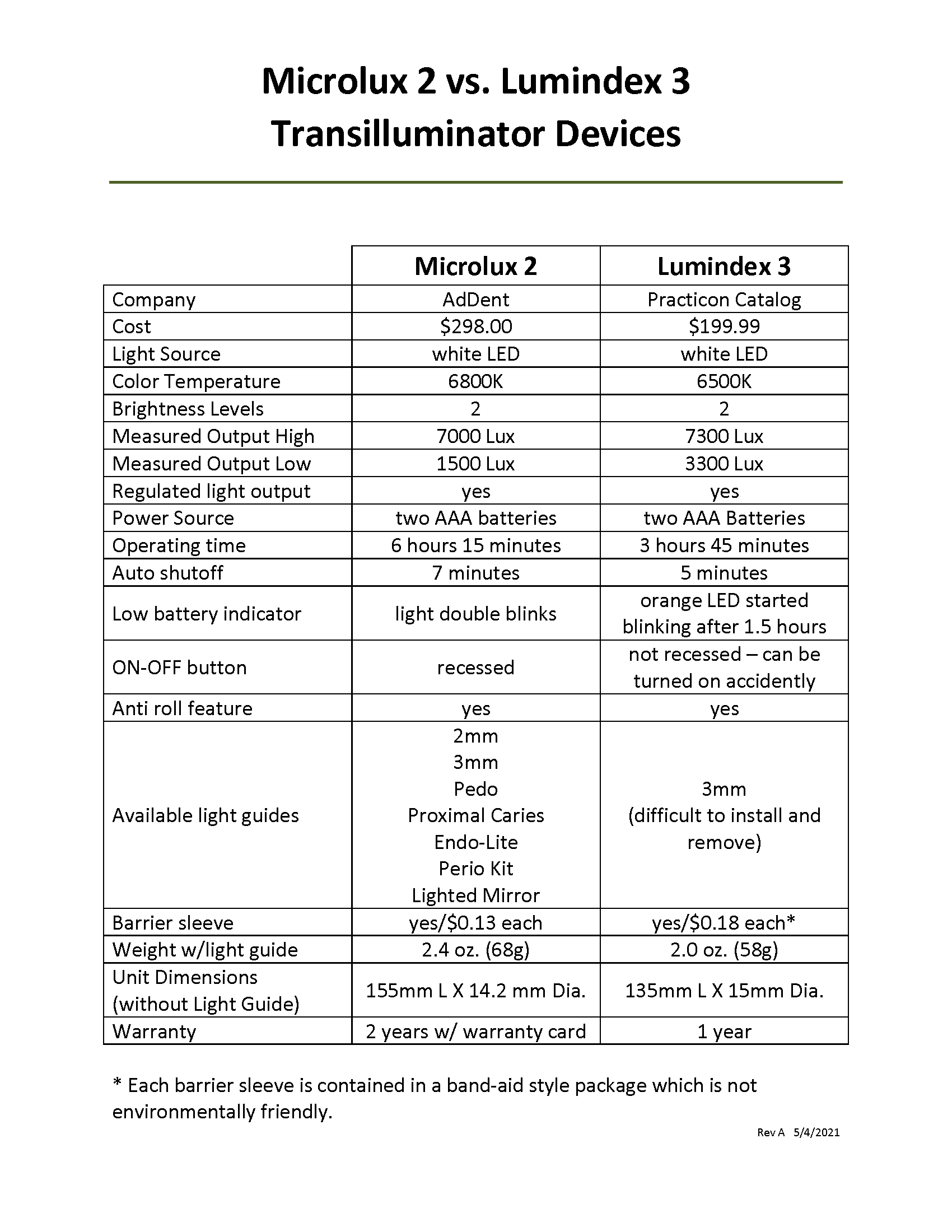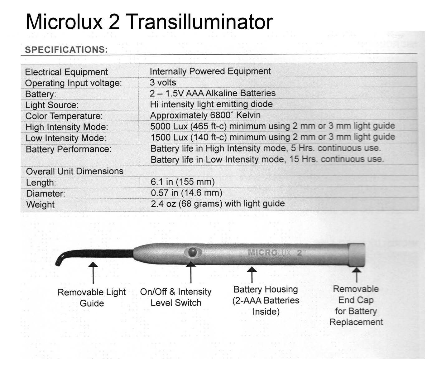 The Microlux 2 Transilluminator is an ergonomic high-intensity model that includes new features that have been requested by many dentists. An easy-to-use push button controls the dual-intensity operation and provides for better visualization. The battery has a low-level indicator, and the unit has a voltage regulator to insure constant light output. It uses 2 easily available AAA batteries. The Microlux 2 comes with a 3mm light guide and accepts all existing Microlux autoclavable attachments.